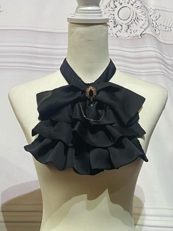 チェーン付きゴシック調フリルタイ:黒×黒石アンティークゴールド