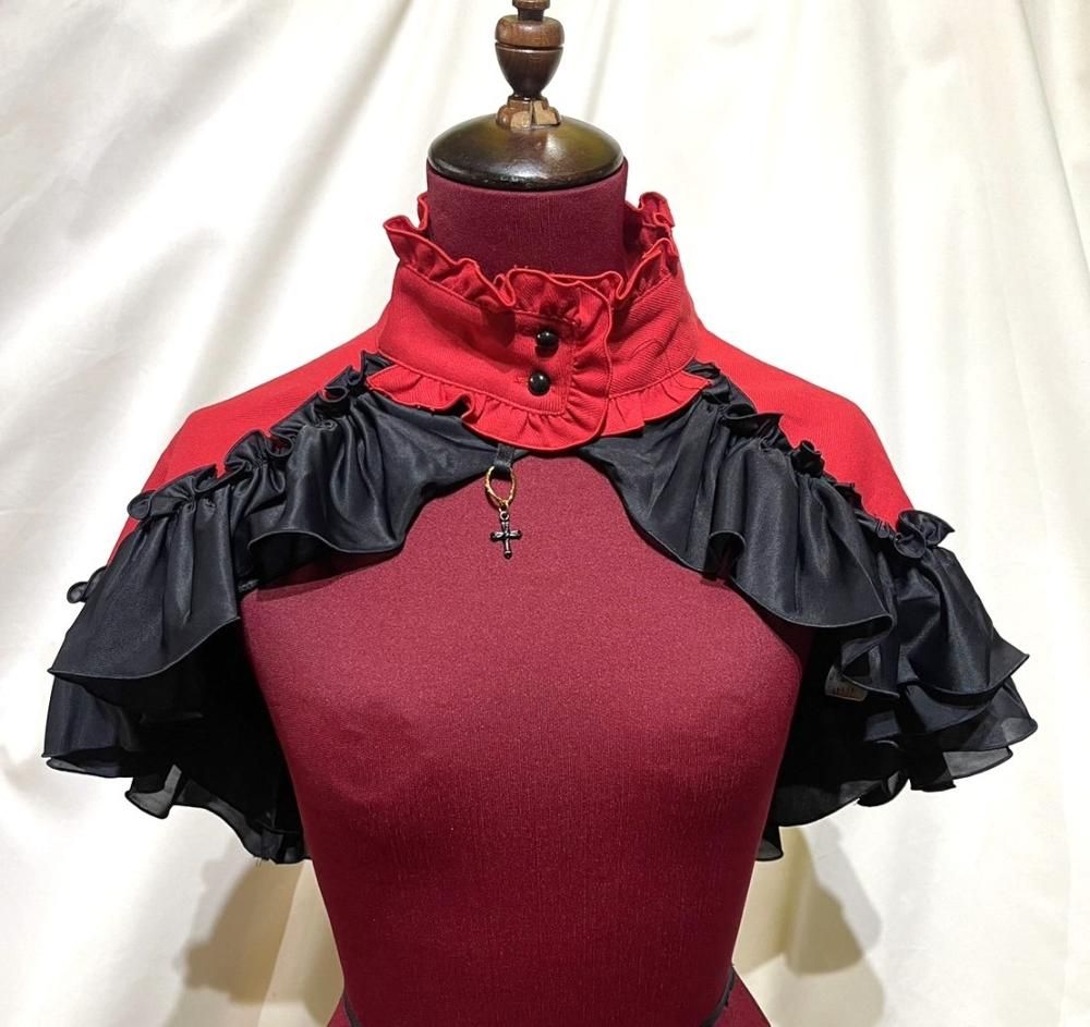 ゴシック調モチーフ付き立ち襟ケープ:赤×黒×黒十字架ゴールド