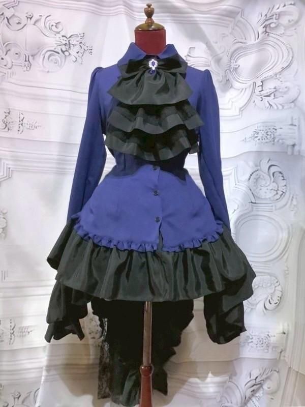 タイ付きドレープ飾りゴシックエレガンスブラウスワンピース:青×黒フリル