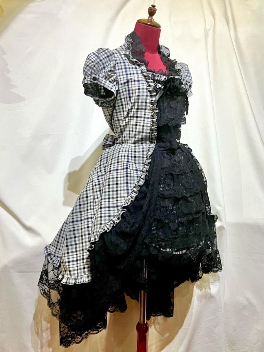 造形美ドレスワンピース:グレー黒チェック×黒レース