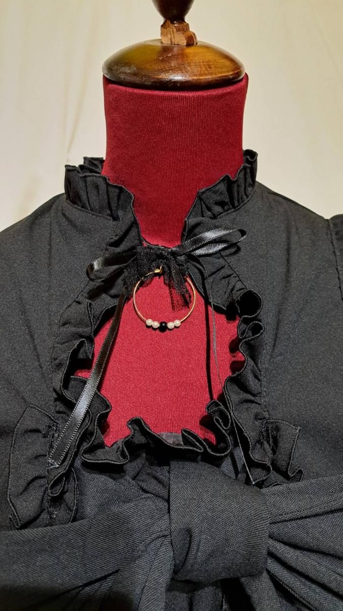 ★レースで飾られた取り外し可能のバッスルリボンとチョーカーが付いた装飾的でデコラティブなビクトリアン調ワンピース。