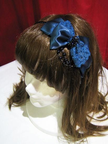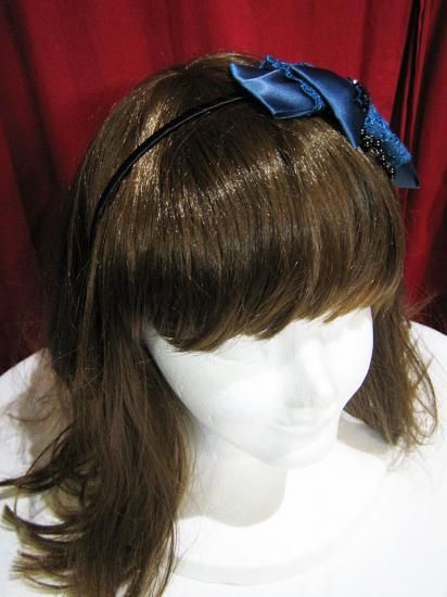 2連黒パールチェーン付きリボンカチューシャ:青サテン