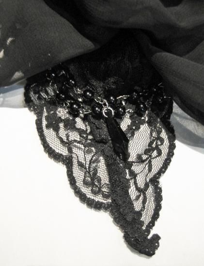 レースベール付きパール飾りバラヘッドドレスス:黒シフォン×黒レース×黒チェーン/黒しずく