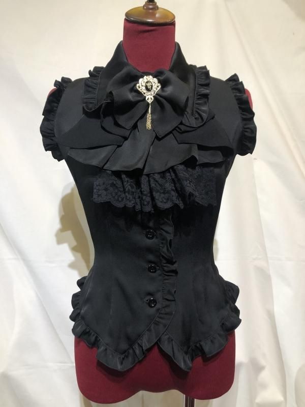◆受注商品◆ブローチコサージュ+フリルタイ付きブラウス:黒光沢×黒×黒レース