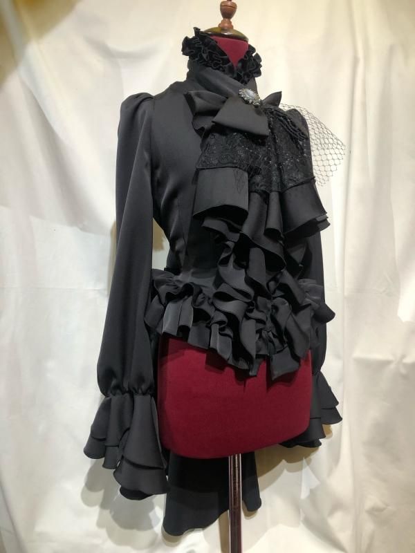 ◆受注商品◆アンティークカメオタイ付きボリュームフリルワンピース型ブラウス:黒