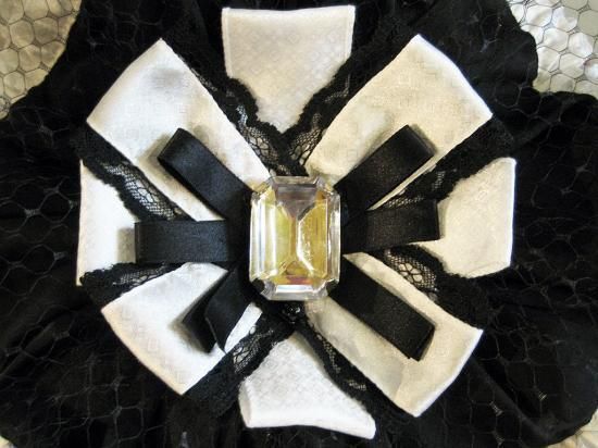 ビジュー付きリボン重ね総フリルヘッドドレス:白柄×黒フリル×クリスタル長方形