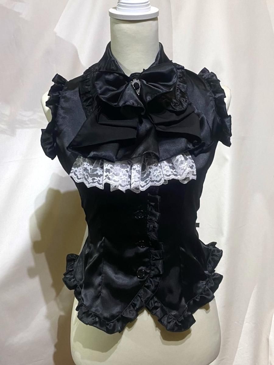◆受注商品◆ブローチコサージュ+フリルタイ付きブラウス:黒×黒×白レース◆Mサイズ◆