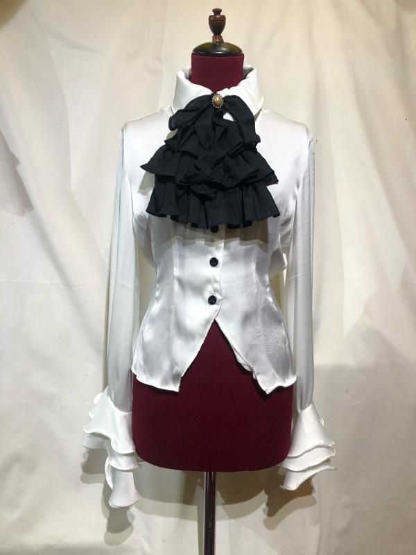ギャザータイ&フリルタイ付きゴシック調ビショップスリーブブラウス:白×黒