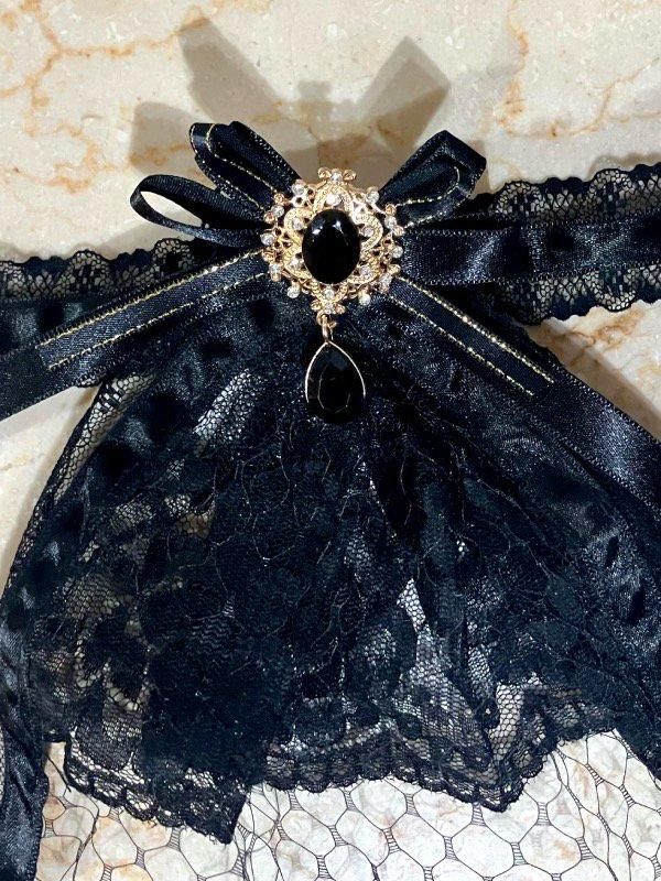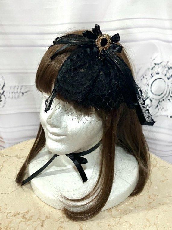 クラシカルカメオコサージュ付き3WAYヘッドドレス:黒×黒ネット(黒石アンティークゴールド)