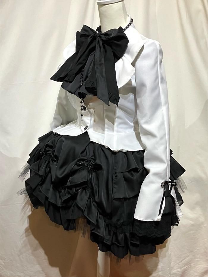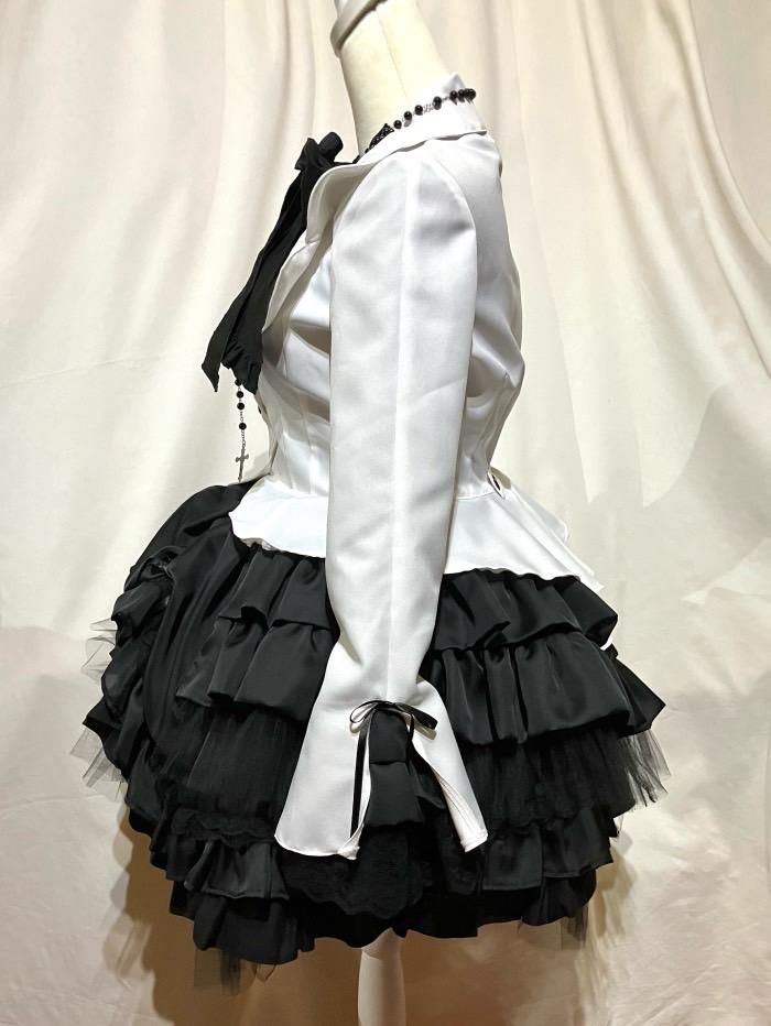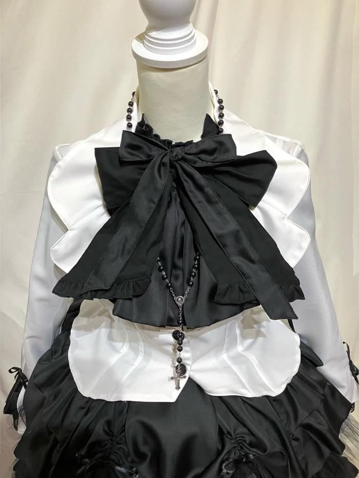 ★ボリュームたっぷりのレイヤードフリルがフェミニンな印象のゴシック調ブラウス付き風ジャブラウス付き風ジャケットで創り出した柔らかな曲線が立体的なフリルスカートと、ボリュームたっぷりの別タイフリル、十字架・聖母マリアのモチーフが神々しいロザリオタイプのネックレスの4点がセットになった全身コーディネート商品です。