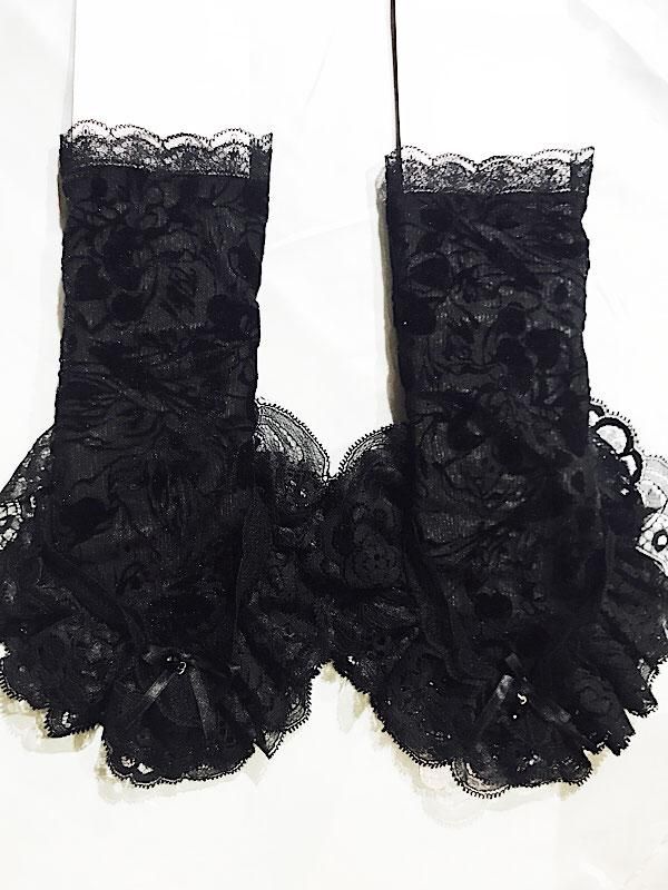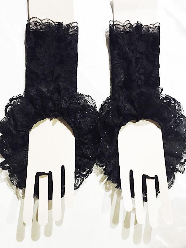 ◆受注商品◆ブローチコサージュ+フリルタイ付きブラウス:黒光沢×黒×黒レース