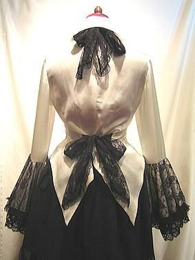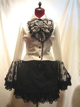◆受注商品◆ネクタイ型フリルタイ付きパフスリーブブラウス+前ギャザースカラップスカート:黒