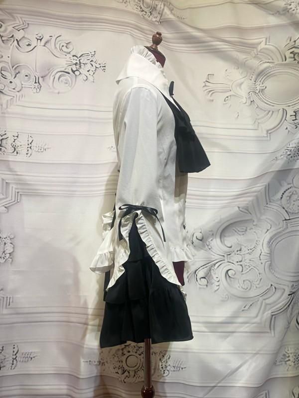 カメオタイ付き後編み上げブラウス:白×黒フリル-メンズLL