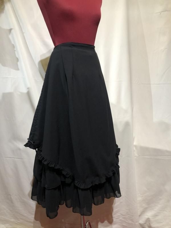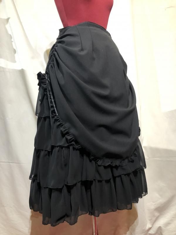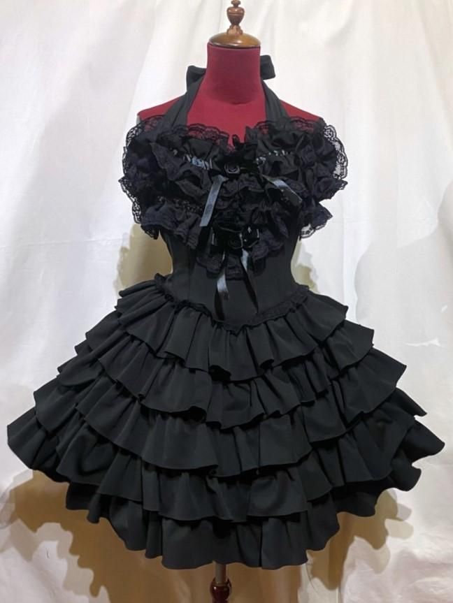 ◆受注商品◆サテンバラ付きレース飾りティアードサンドレス:黒×黒レース×黒サテンバラ