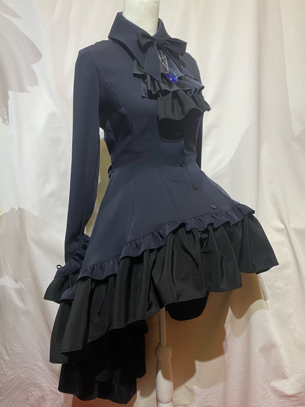 ゴシック調ダイヤカットタイ付きブラウス型ワンピース:濃紺×青楕円石