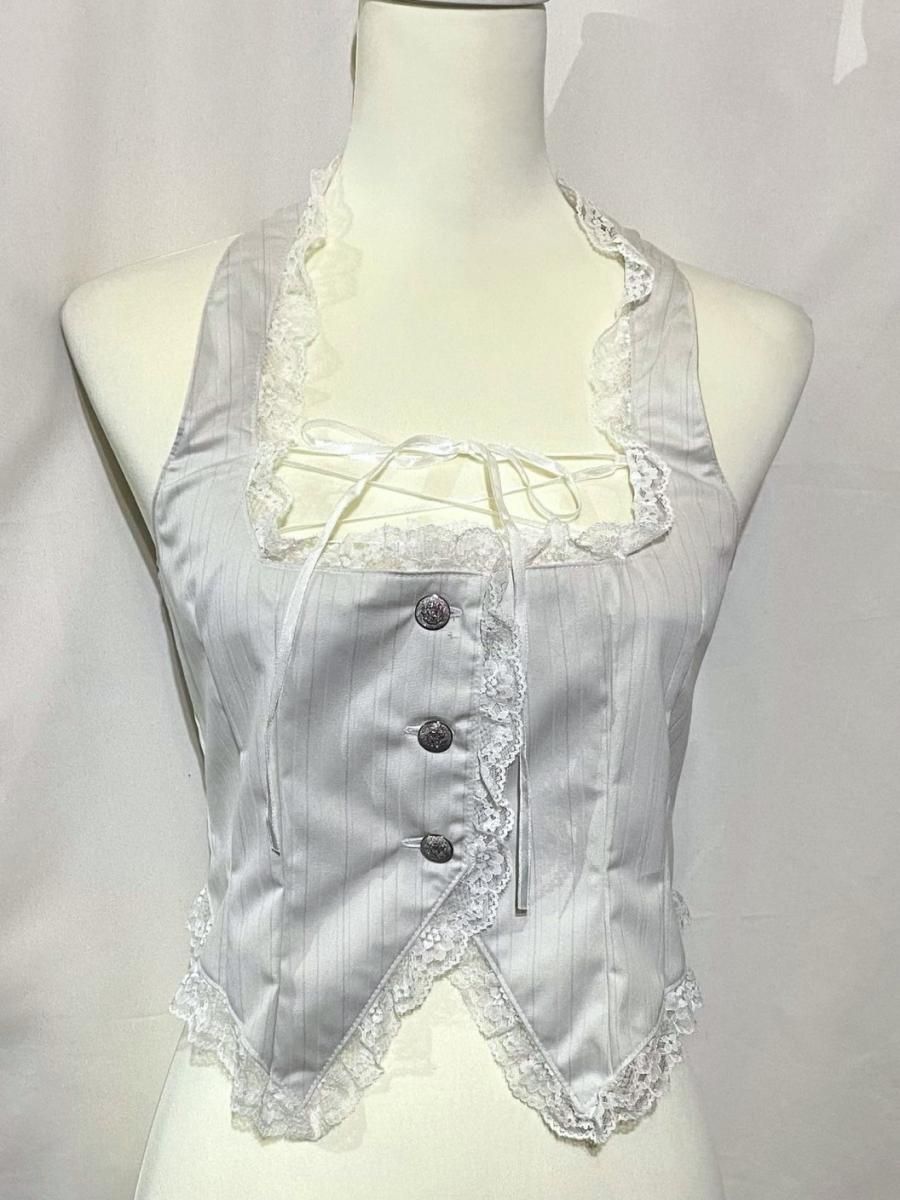 ◆受注商品◆胸元編み上げコルセット風ベスト:白ストライプ×白レース