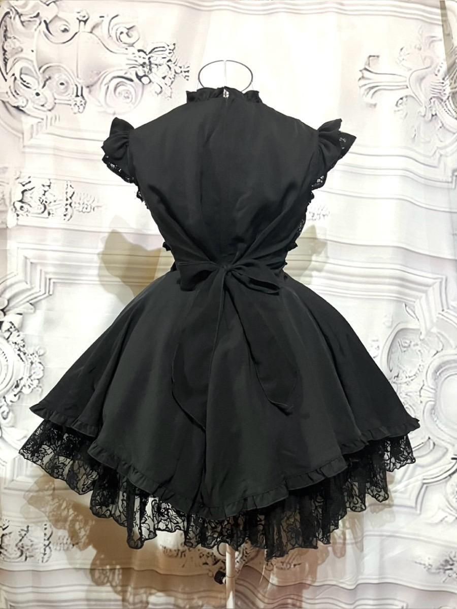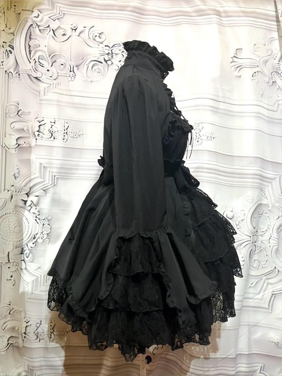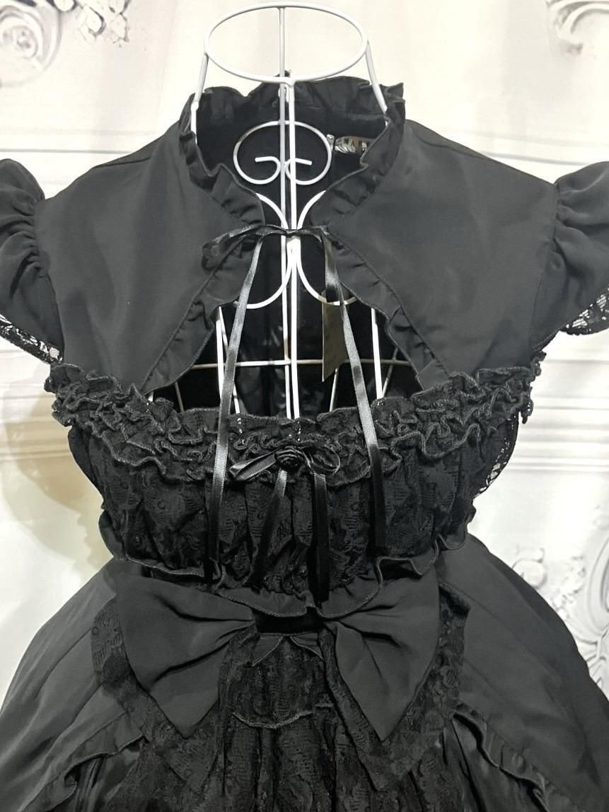 ギャザータイ&フリルタイ付きゴシック調ビショップスリーブブラウス:白×黒