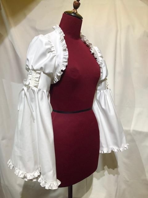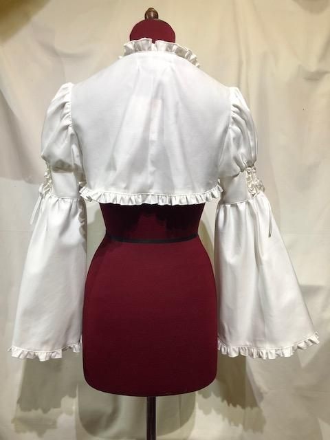 ★ふっくらふくらんだパフスリーブを切り替えて編み上げ、裾に向かい大きく広がったベルスリーブデザインが独特なショートボレロです。