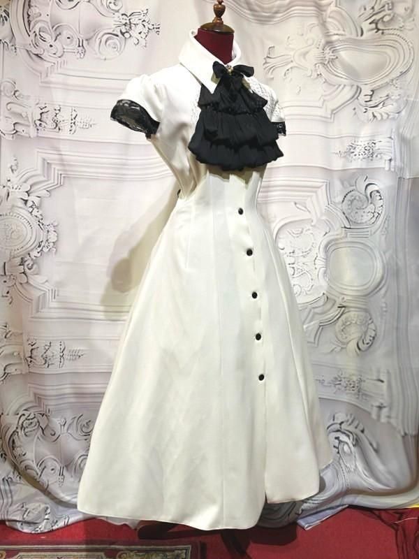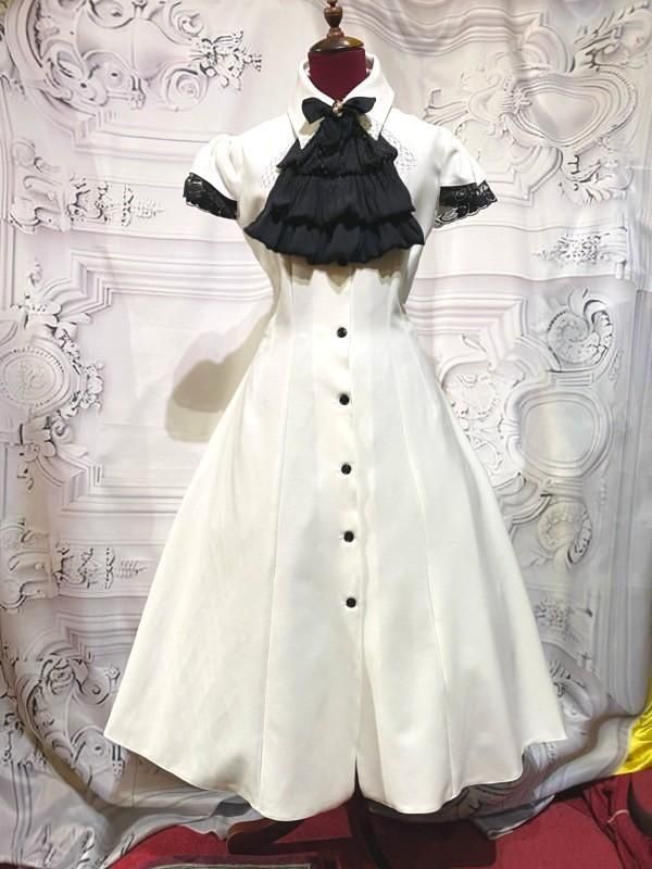 アンティークカメオタイ付きボリュームフリルワンピース型ブラウス:白×白レース地