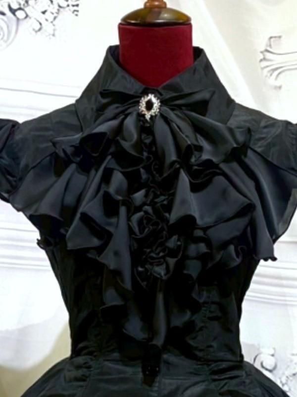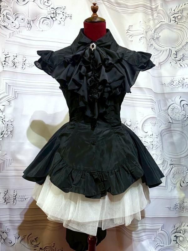 ★ゴシック調の華やかなドレープタイがついた前が短く、後ろが長いジャケット型のドレープワンピースです。