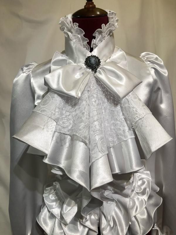 アンティークカメオタイ付きボリュームフリルワンピース型ブラウス:白×白レース地
