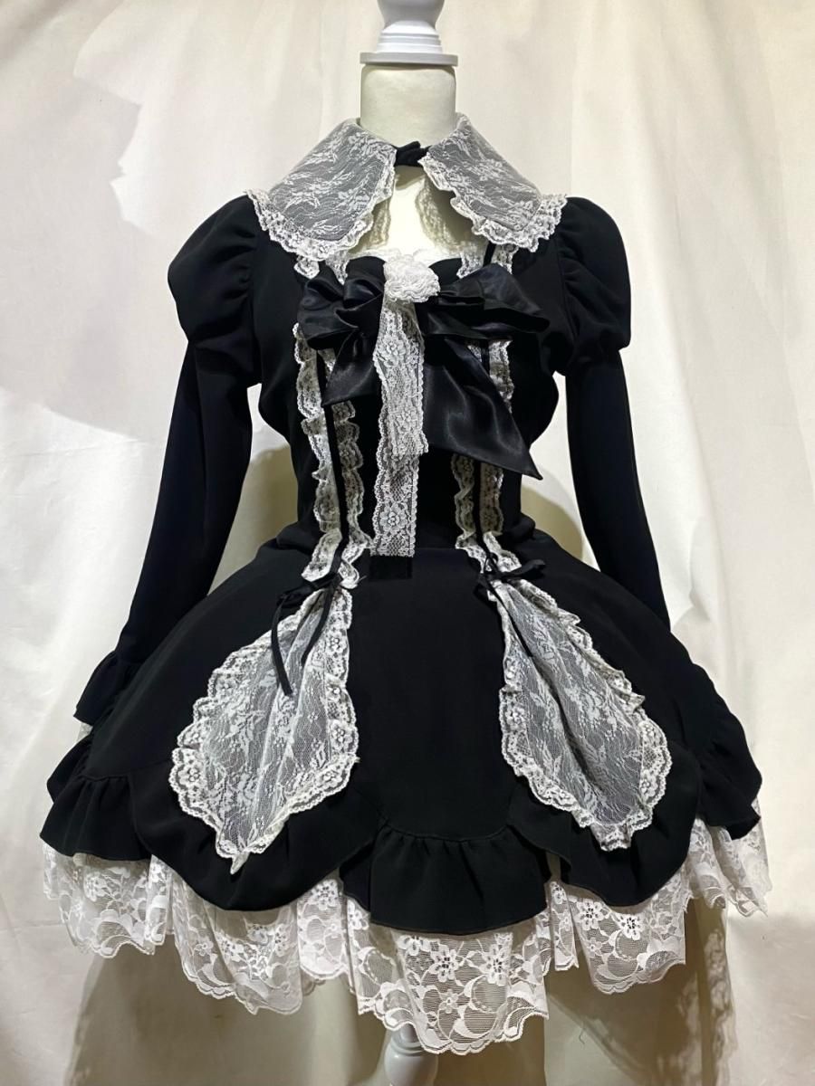 つけ衿付きバラリボンデコレーションワンピース+パ二エ:黒白×白パ二エ