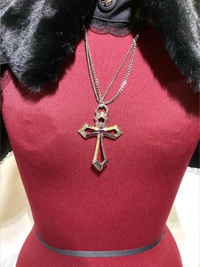 ★パールチェーンやシルバーチェーンでデコルテされた大振りのクロスが目を引くファー衿ケープです。