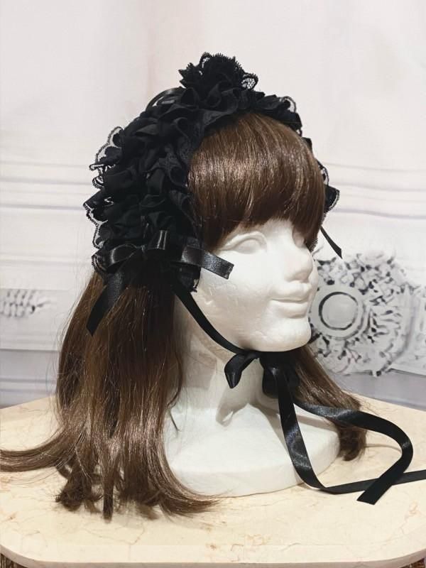 レースバラ付きボリュームフリルヘッドドレス:黒×黒レース×黒レースバラ