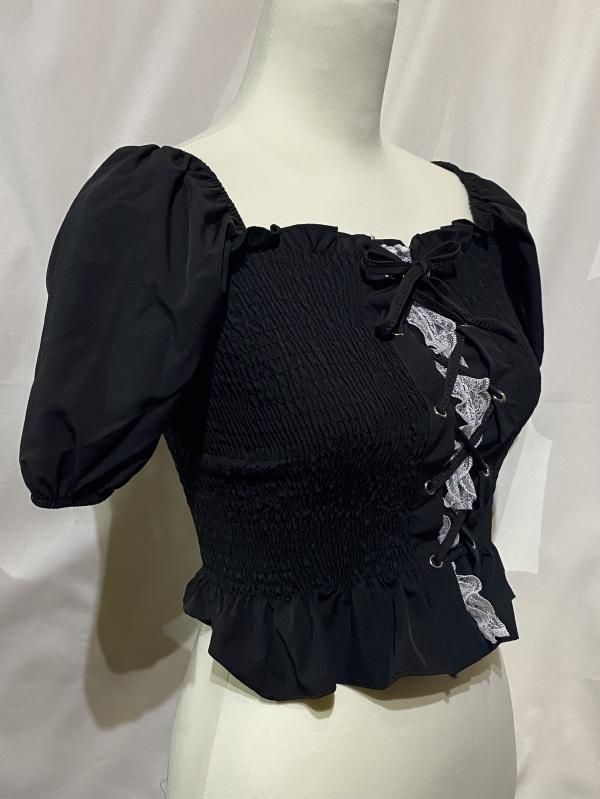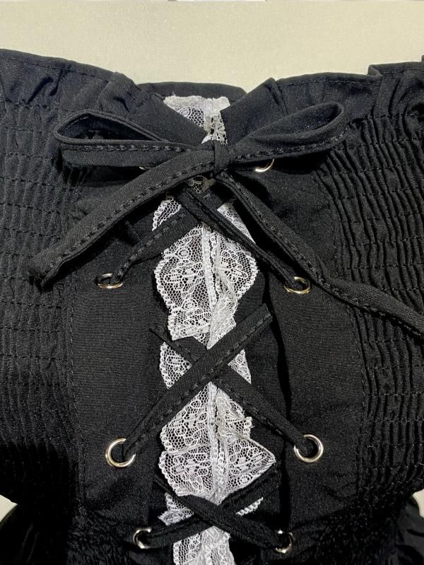 ◆受注商品◆ネクタイ型フリルタイ付きパフスリーブブラウス+前ギャザースカラップスカート:黒