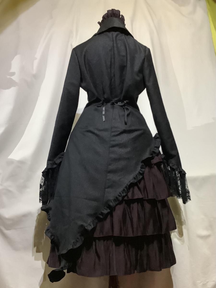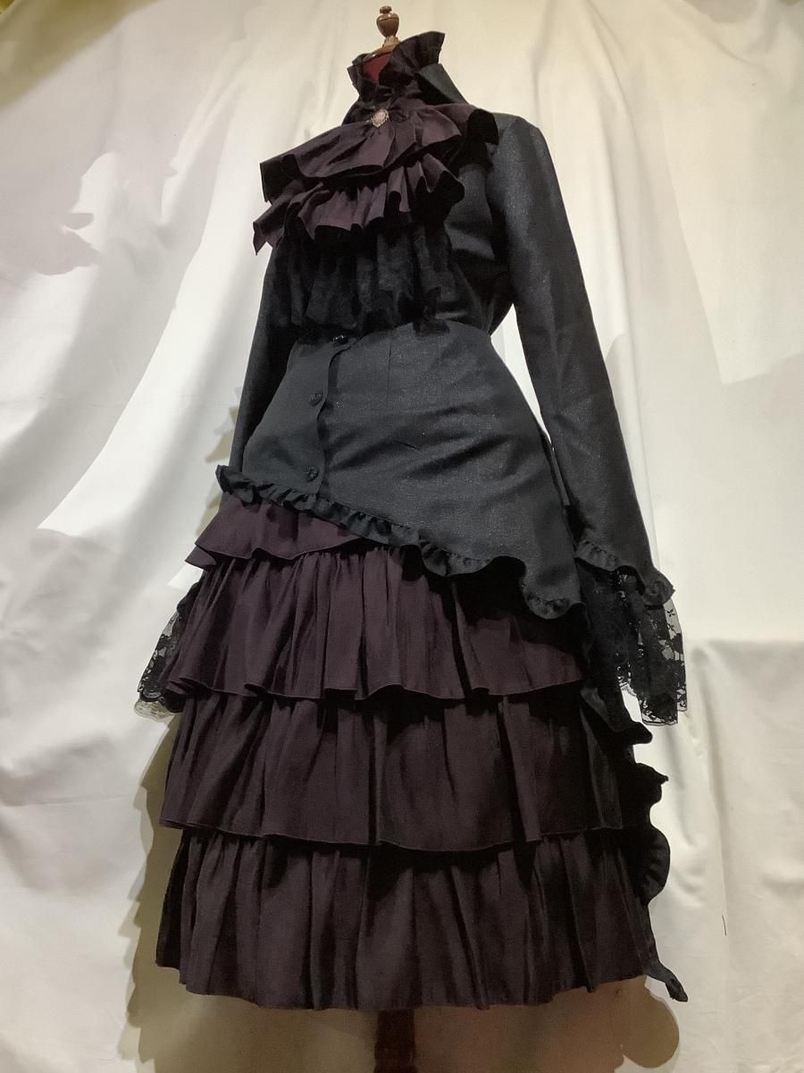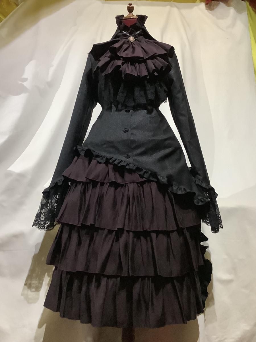 中に立ち衿のブラウスを着ている様に見えるジャケットワンピースにアンティーク調のカメオモチーフが豪華なタイと豪華なロングドレススカートがついたエレガンスゴシック調のお得な全身コーディネート商品です。