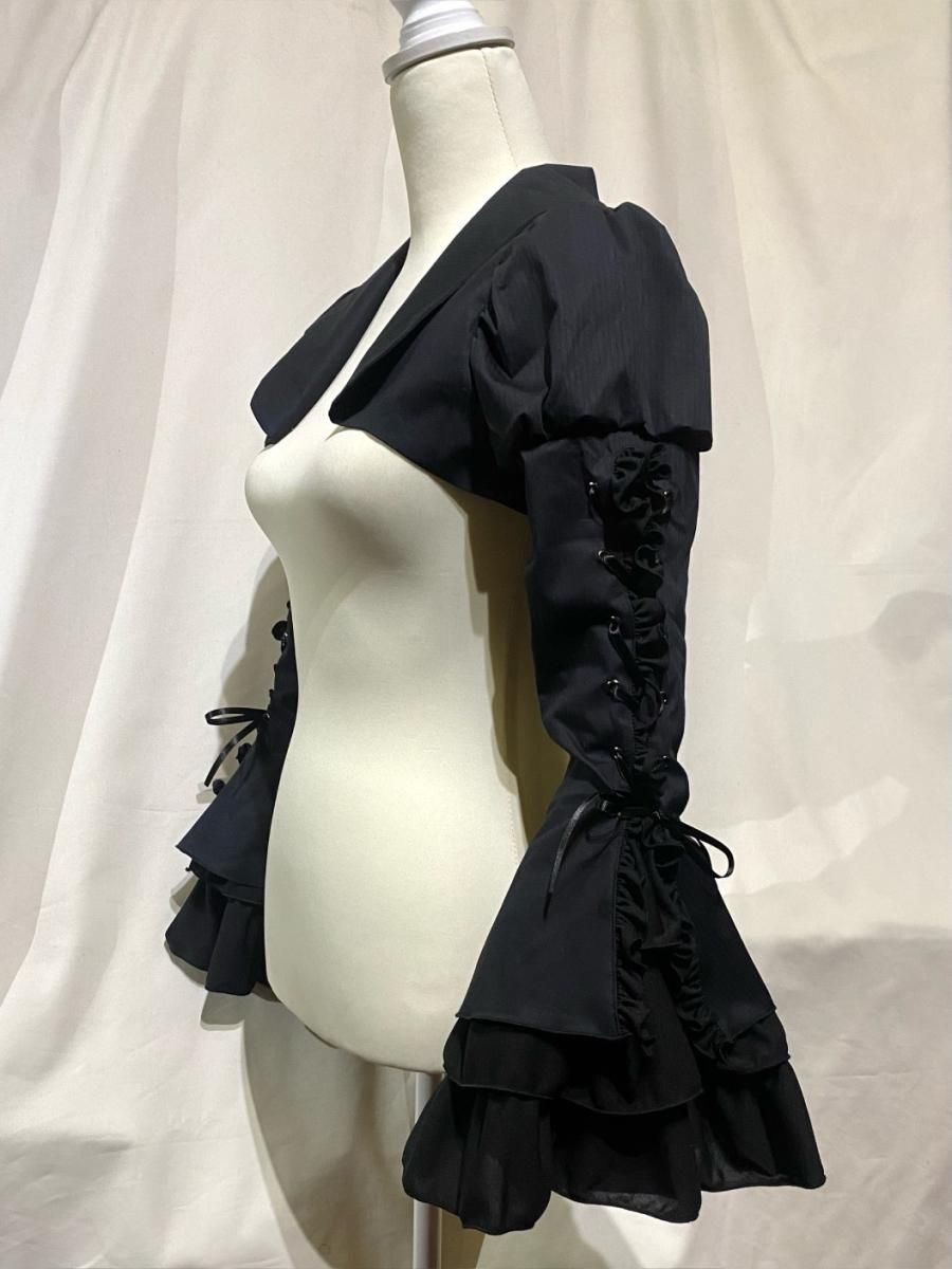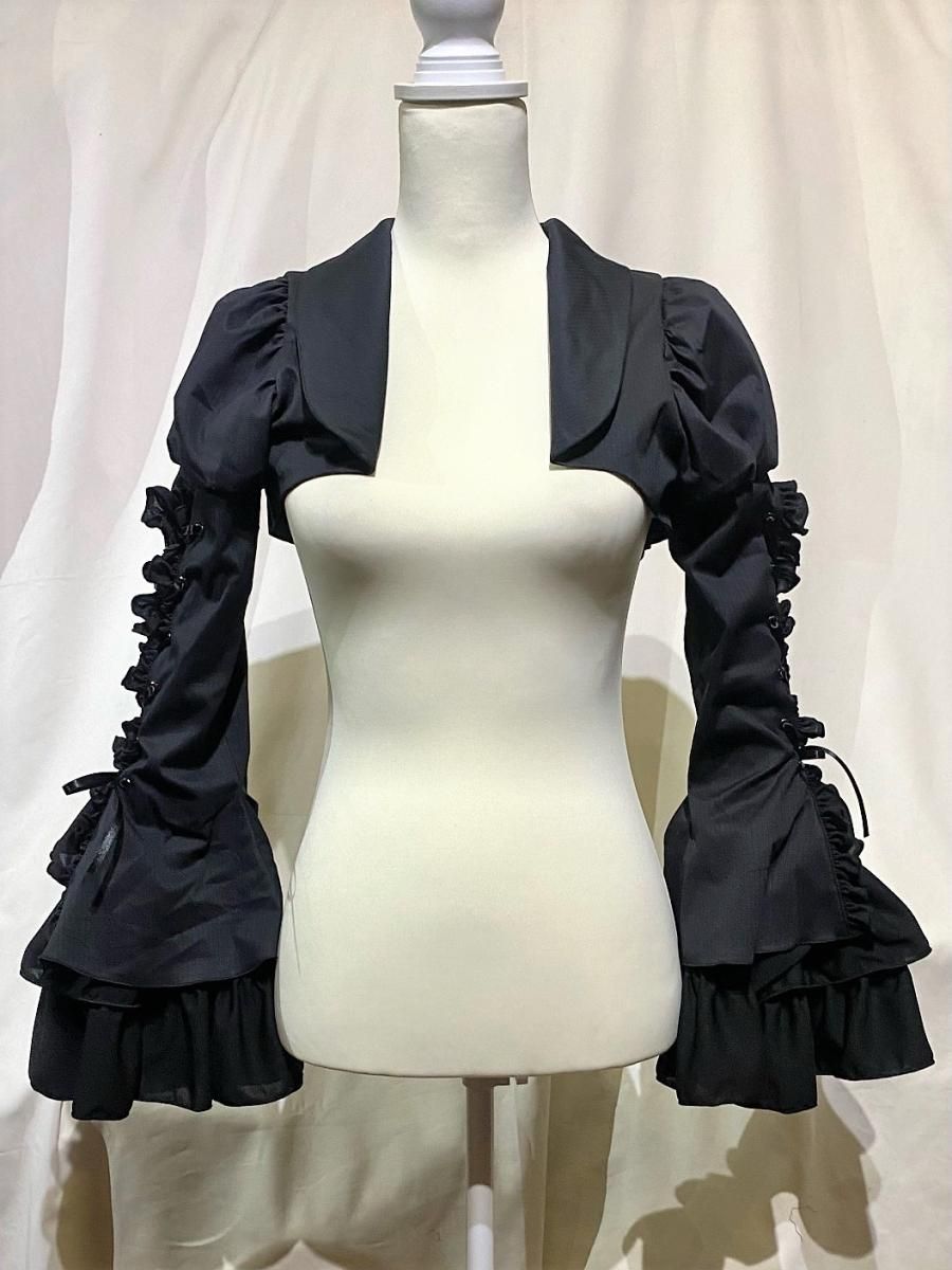 ゴシック調タイ付き総フリルパフスリーブブラウス:白ストレッチ