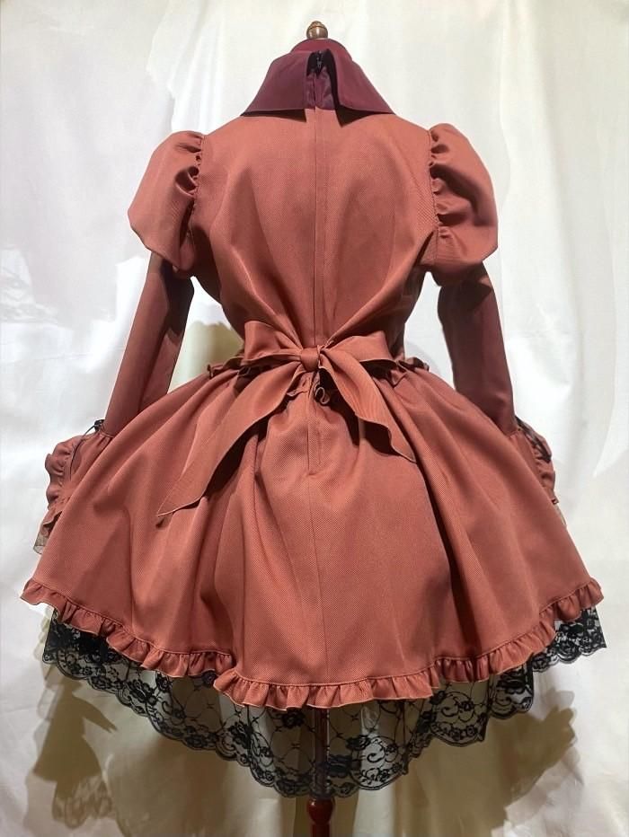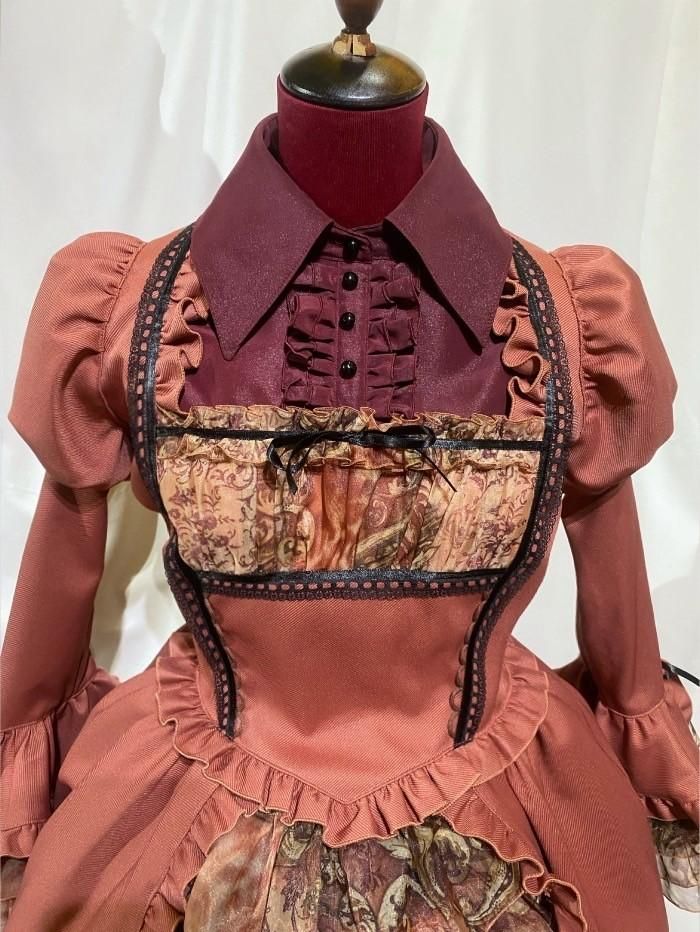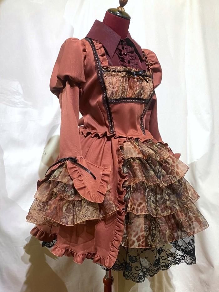 ブラウス&スカートセットアップ風全身コーディネートワンピース:えんじ×茶えんじアンティーク柄フリル