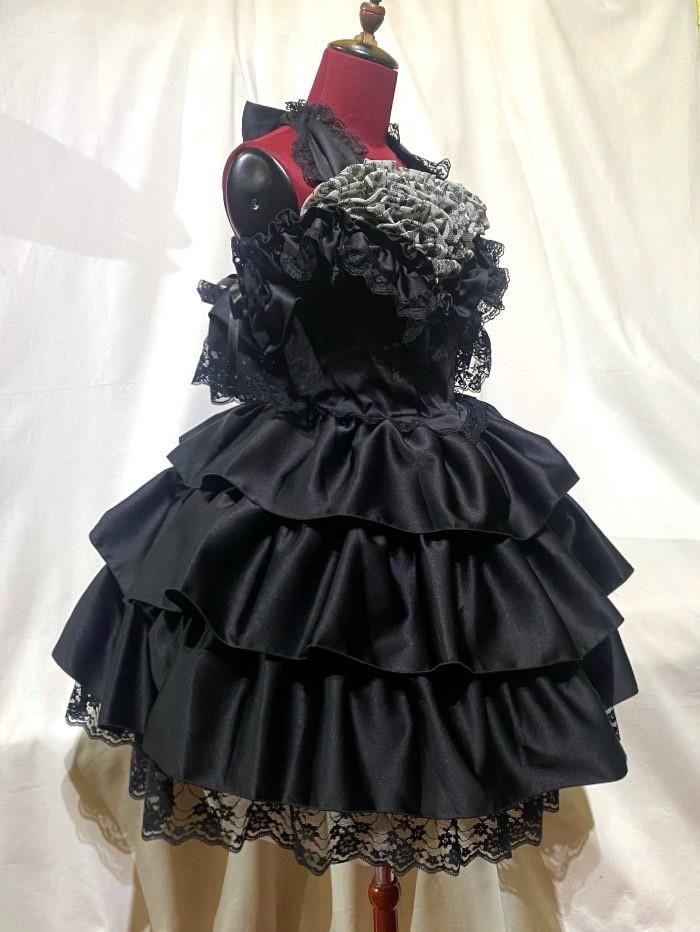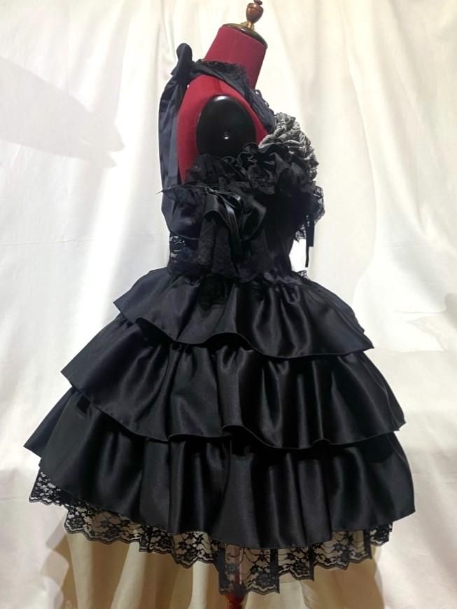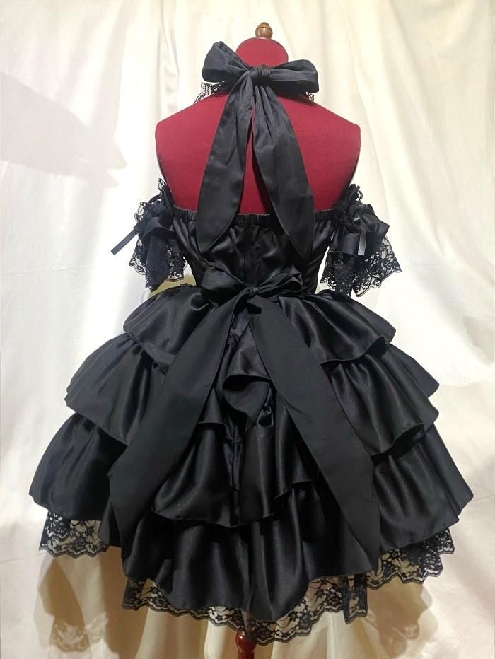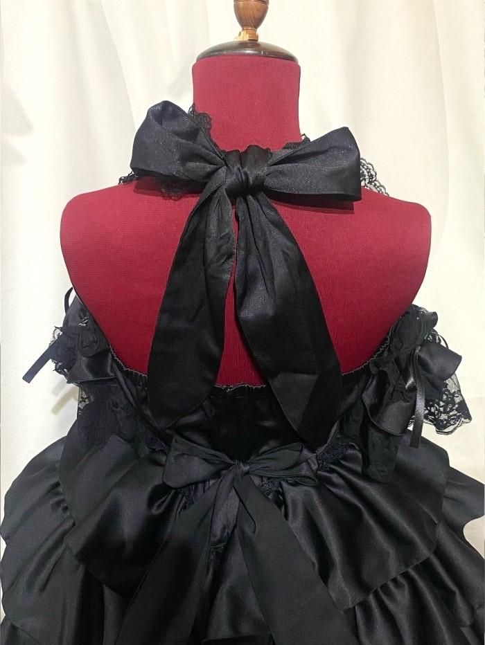 総フリルロマンティックサンドレス:黒×白花柄アンティーク柄フリル