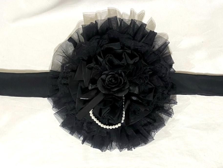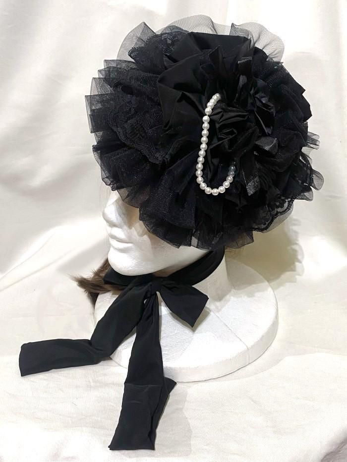 ★重ね合わせたボリュームフリルが大輪に咲き誇る花のような、デザインの豪華なボンネットです。