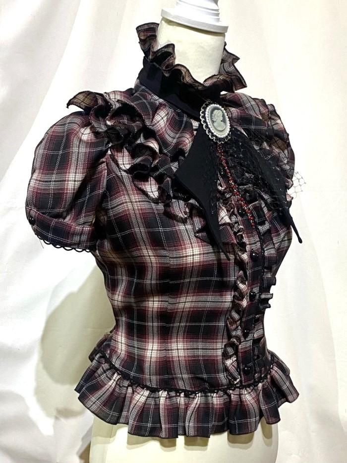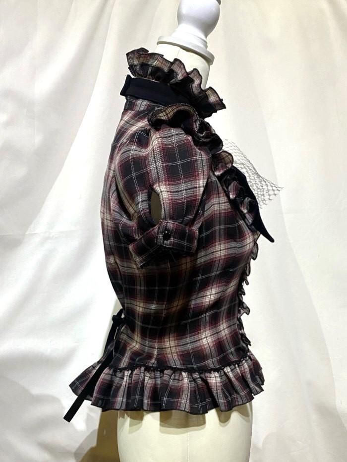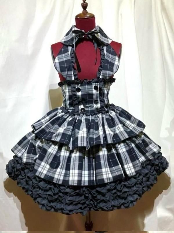 ラウンド衿付きコルセット型ワンピース:白黒グレー紫ラインチェック×グレーフリル