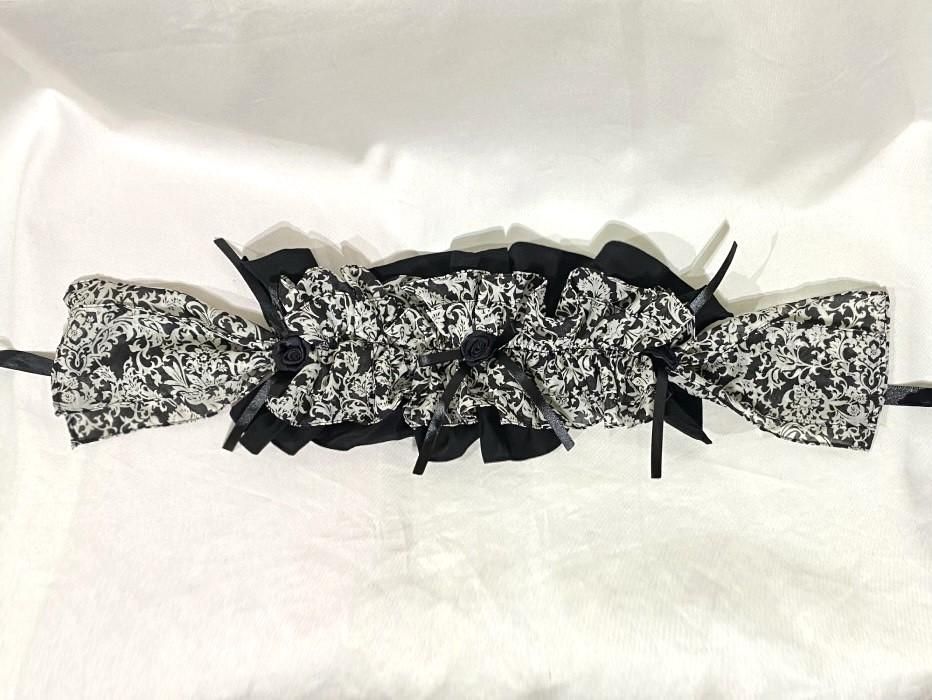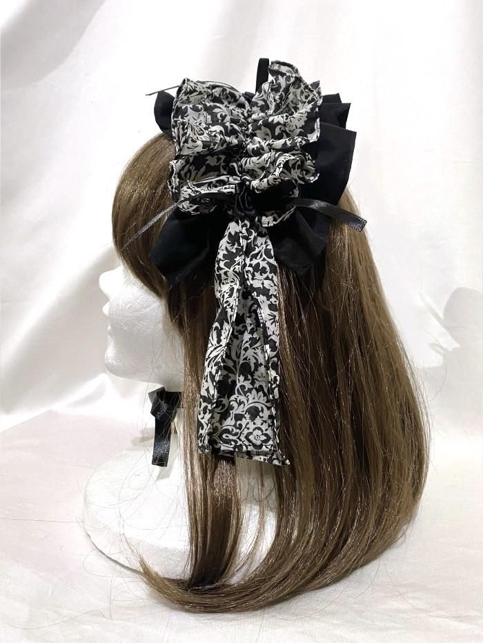 ボリュームフリルフェミニンヘッドドレス:黒×黒地白柄×黒バラ