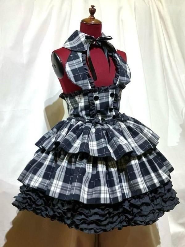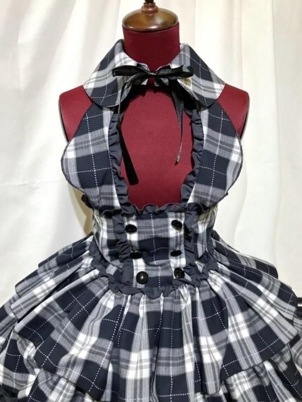 ラウンド衿付きコルセット型ワンピース:白黒グレー紫ラインチェック×グレーフリル