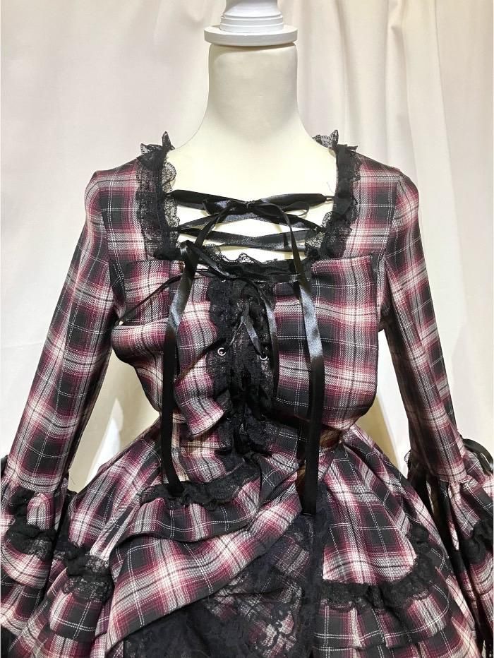 ◆受注商品◆編み上げ総フリルドレスワンピース:黒赤チェック×黒レース