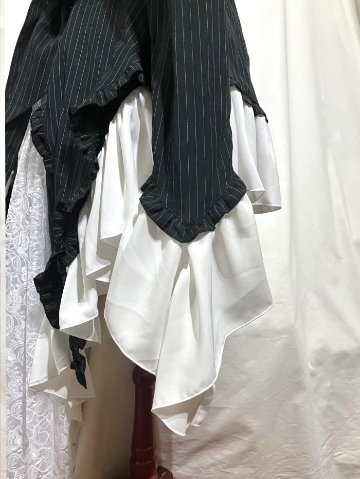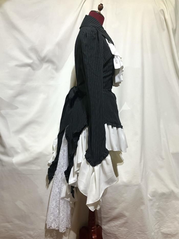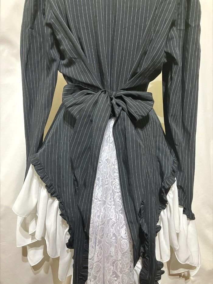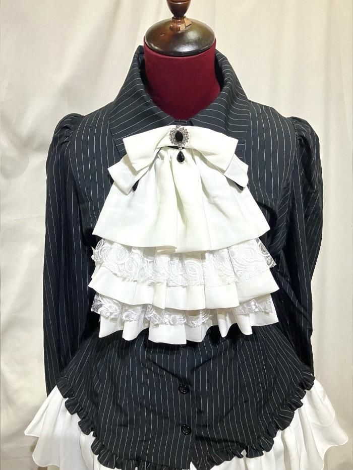 ◆受注商品◆ブローチコサージュ+フリルタイ付きブラウス:黒ゴシック柄光沢プリント×黒×黒レース