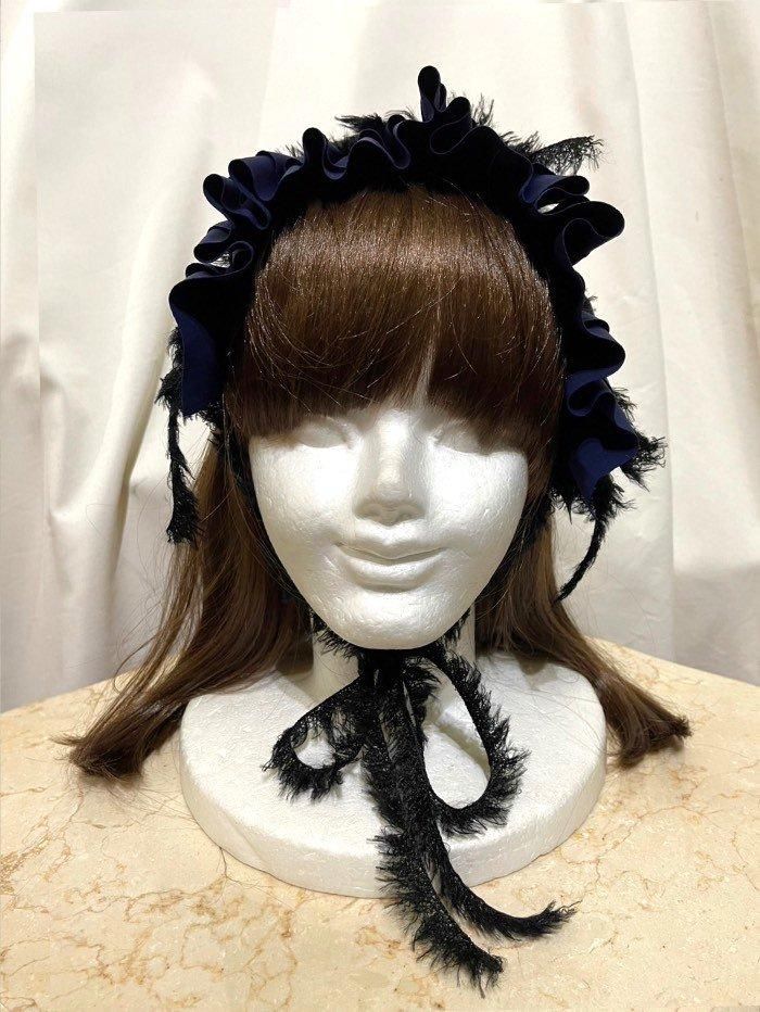 ◆受注商品◆リボン重ねパールきバラボンネット:黒ストライプ×黒ネット×白パール