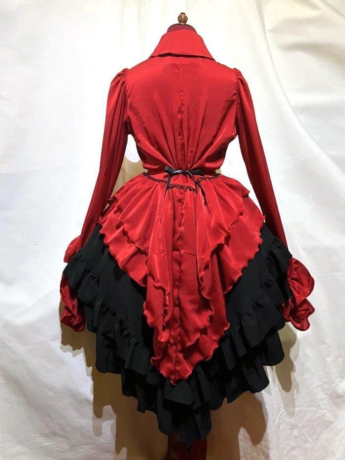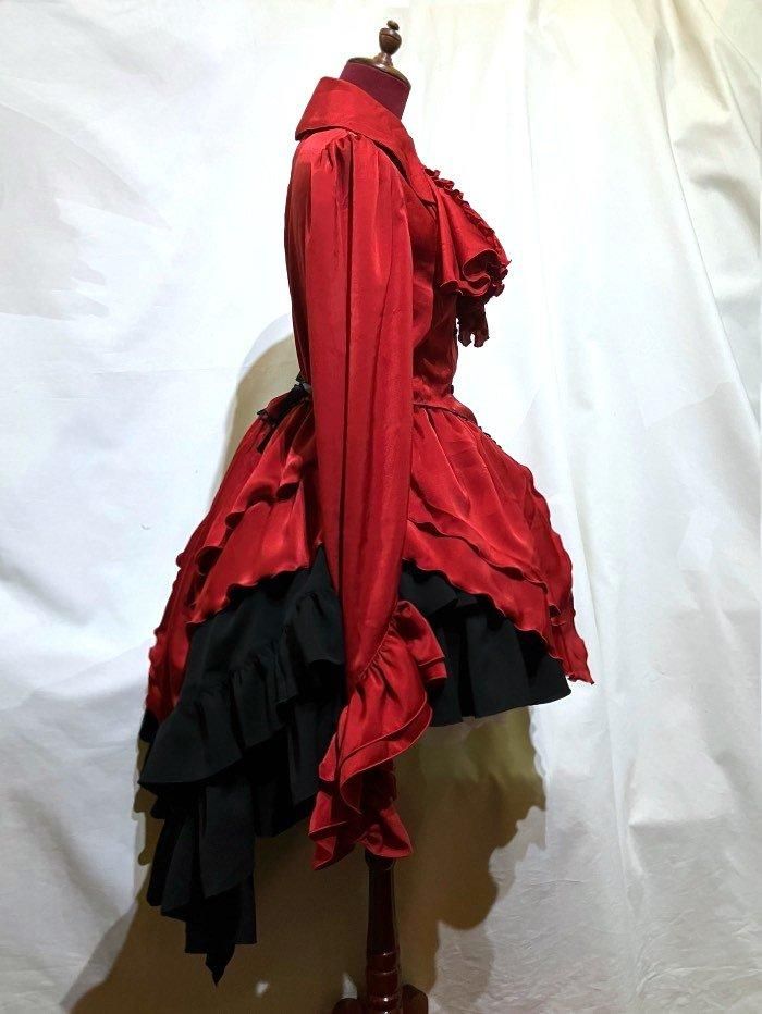◆受注商品◆ゴシック調ドレープフリルタイ付きワンピース型ブラウス+前短・後長V字フリル重ねロングスカート:赤×黒