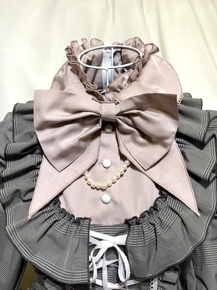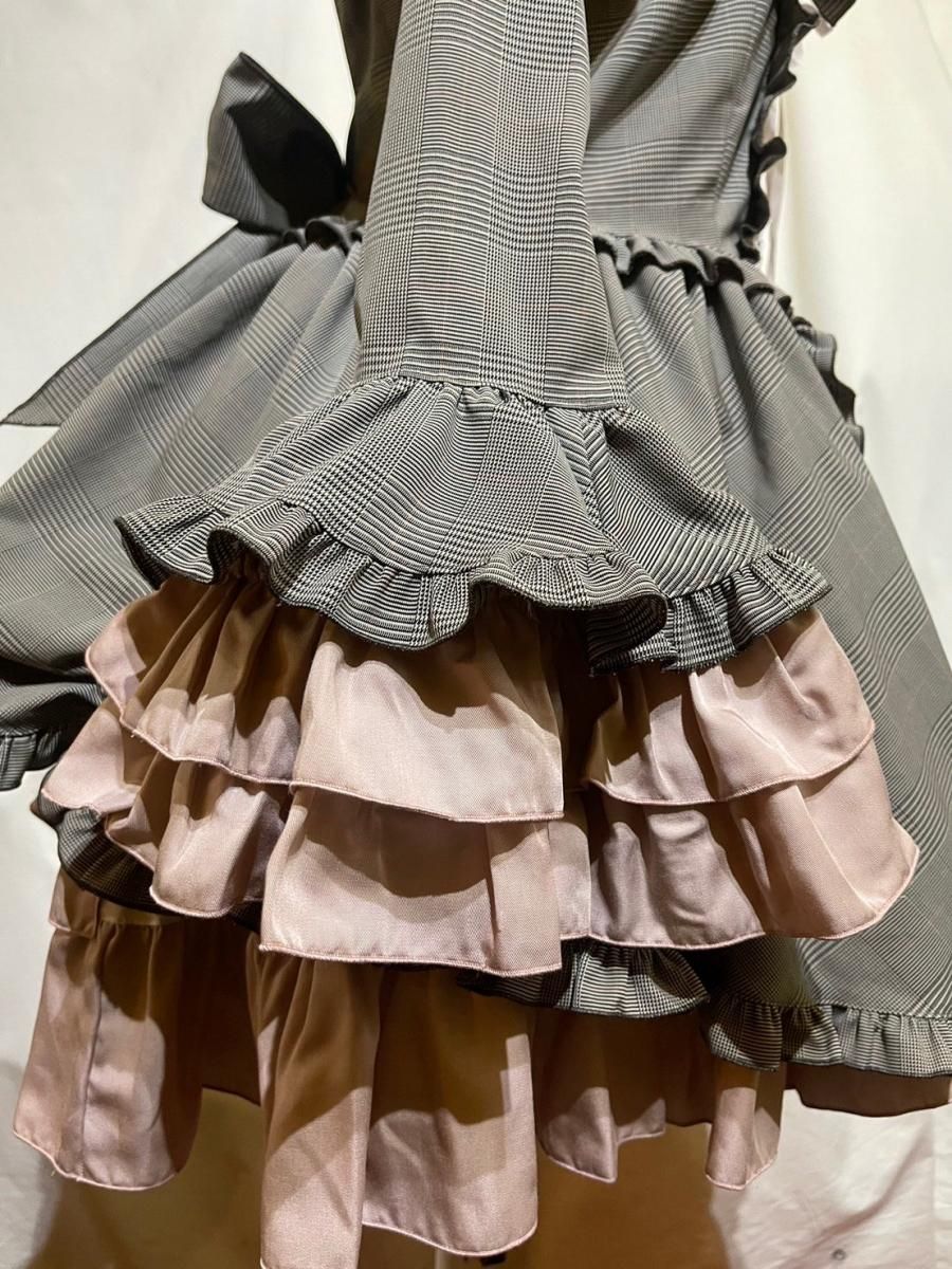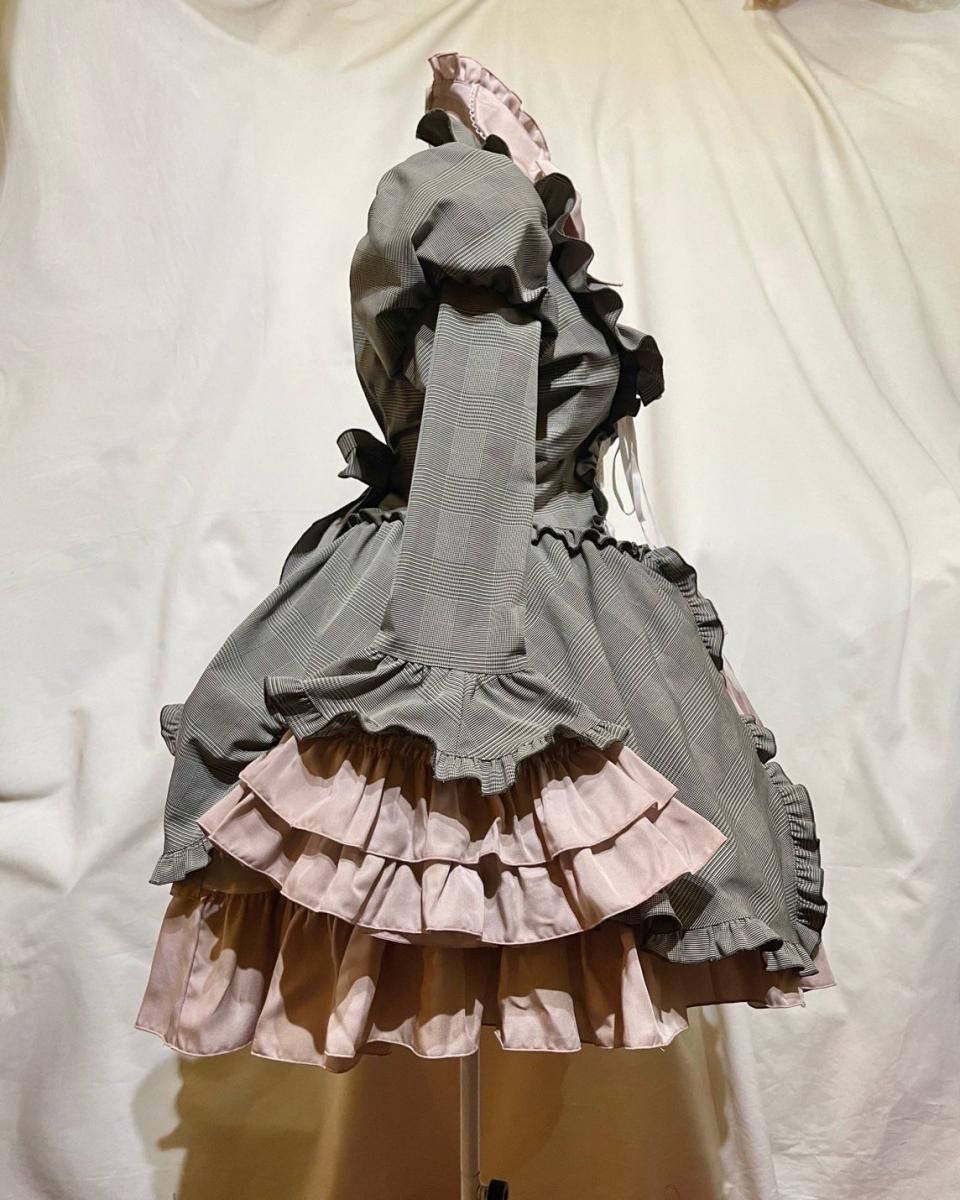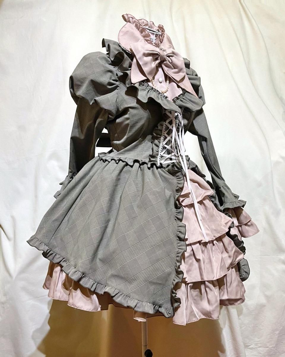 ◆受注商品◆アリス風編み上げドレスワンピース:ピンクライングレーグレンチェック×ピンクフリル×薄ピンクパール