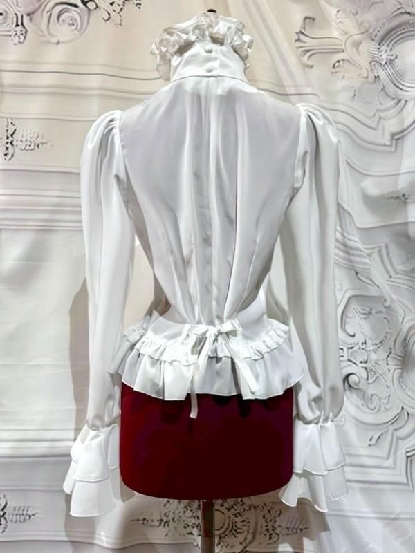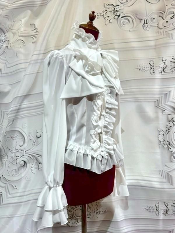 ビジュー付きリボンタイフリルブラウス:白◆Lサイズ◆