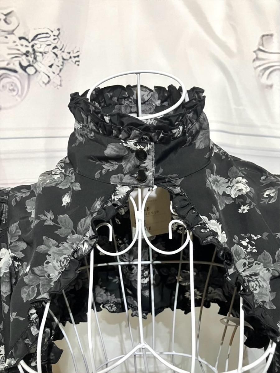ジャケット調ギャザー姫袖ボレロ:黒グレーバラ柄