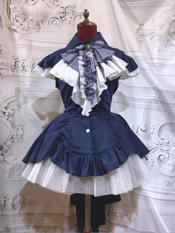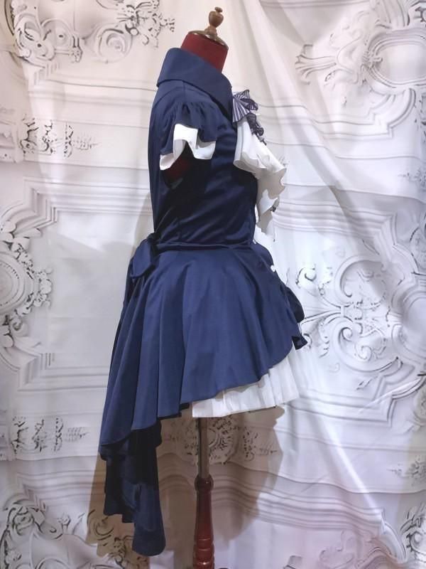 ゴシック調エレガンスタイ付きジャケット型ドレープワンピース:紺ブルーニット×ブルーストライプ