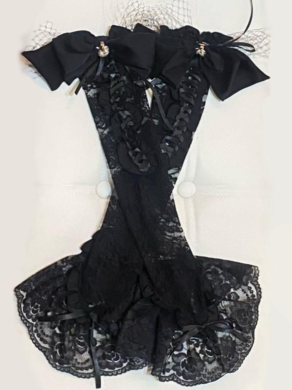 切り替え総フリルワンピース+パニエ入りボリュームレース付きスカート:黒×白レース