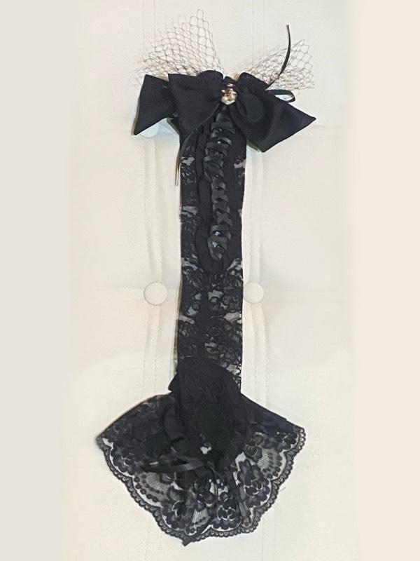 コサージュ付きクラシカル編み上げグローブ:黒レース×白パール