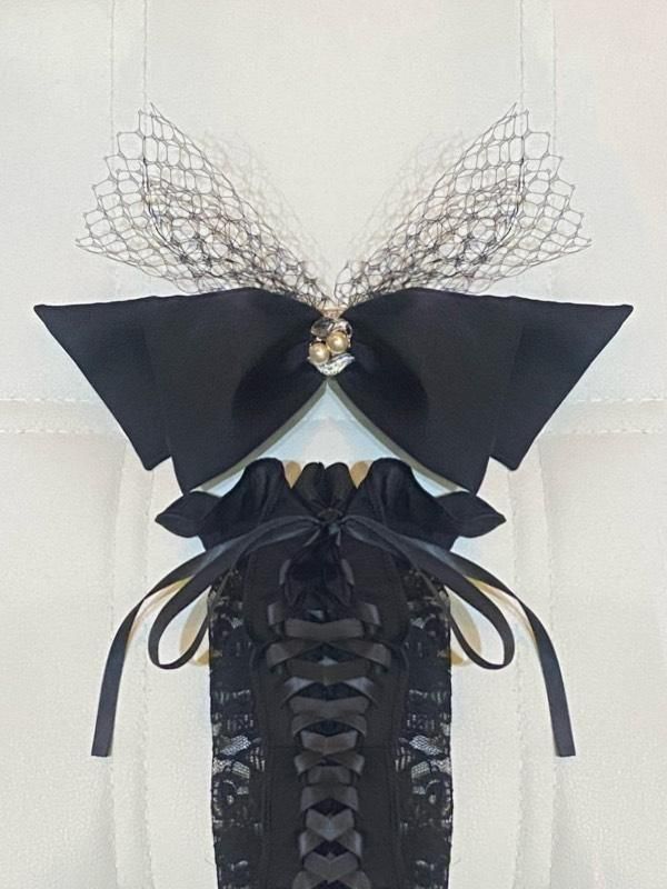 十字架モチーフネクタイ付きビスチェ型コルセット風ブラウスワンピース:黒×白×黒タイ
