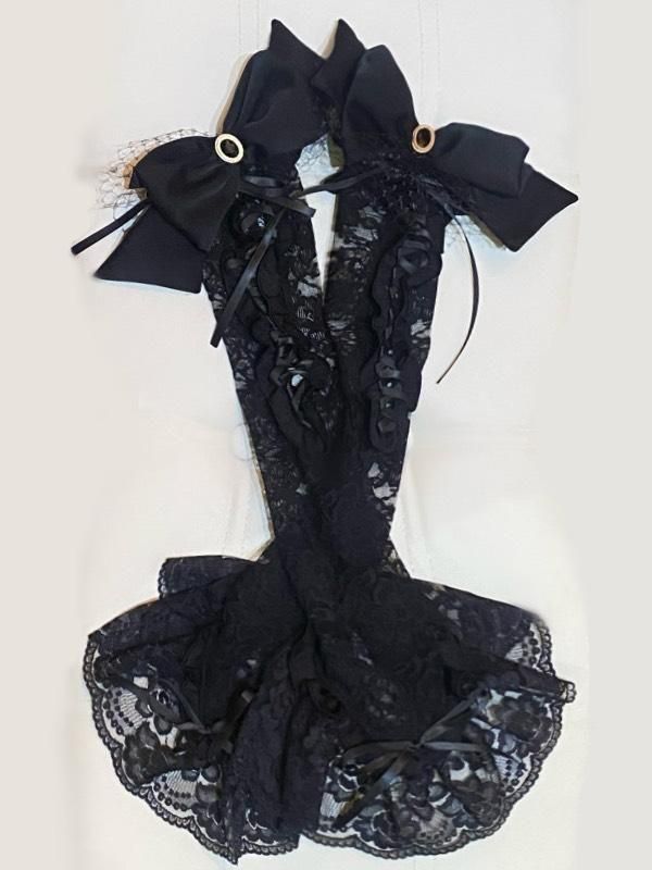 コサージュ付きクラシカル編み上げグローブ:黒レース×黒石