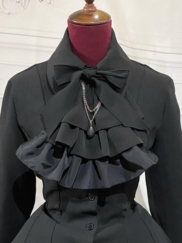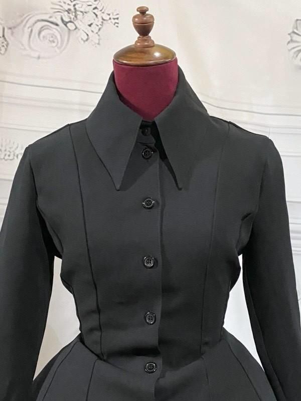 ゴシック調の重厚なアクセサリーの付いたシックでエレガントなブラウス型ワンピースです。
